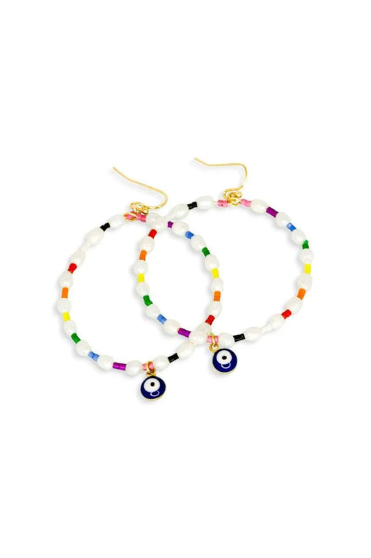 Evil Eye Stone Pearl with Seed Beads Metal Hoop Earrings